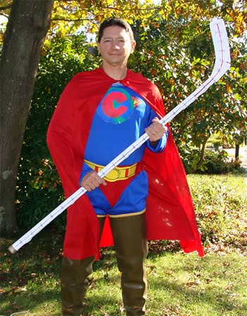 (Meteorologian professori, "Carbonman" Scott Mandia taistelee Mannin jääkiekkomailalla ilmastoepäilijöitä vastaan)